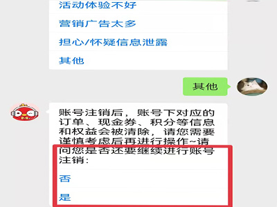 4、根据客服提示回答问题,如确定注销当前咨询账号、选择注销账号的原因。