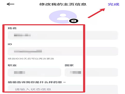 3、给角色起个名字,输入ID、职业和国家,点击右上角的“完成”即可,注意修改ID30天后才可以再次修改。