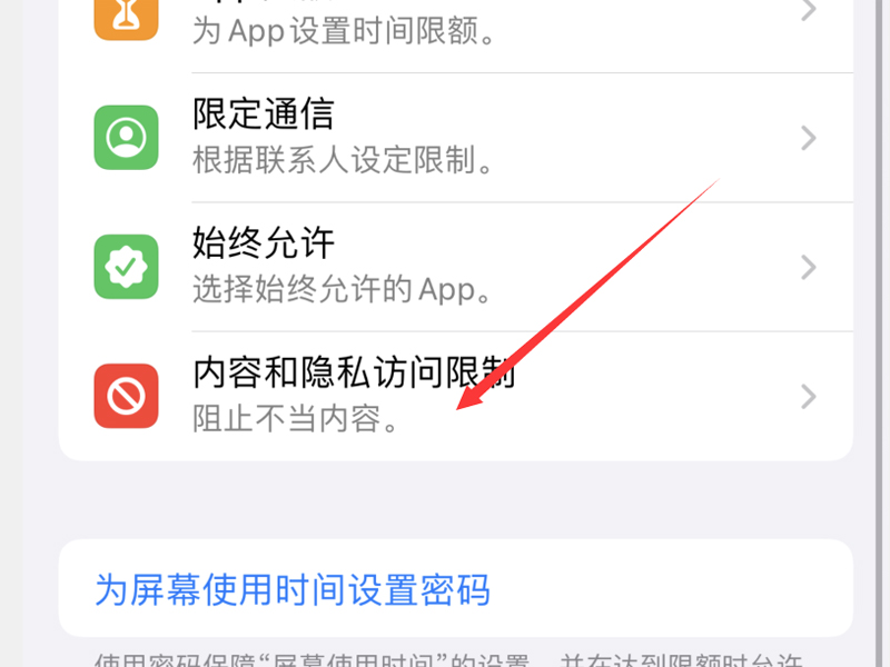 2、点击“内容和隐私访问限制”按钮,进入内容和隐私访问限制的页面。