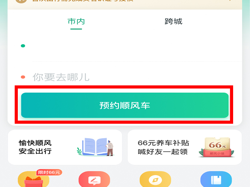 3、进入“顺风车”界面后,输入目的地和出发地,再点击“预约顺风车”即可。