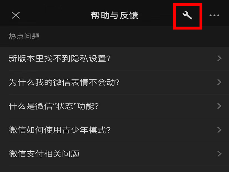3、进入“帮助与反馈”界面后,点击右上角的“扳手”符号。