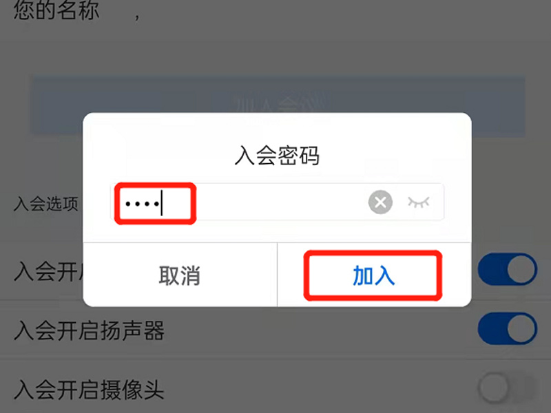 2、输入会议号,点击“加入会议”,输入密码点击“加入”即可进入会议页面。