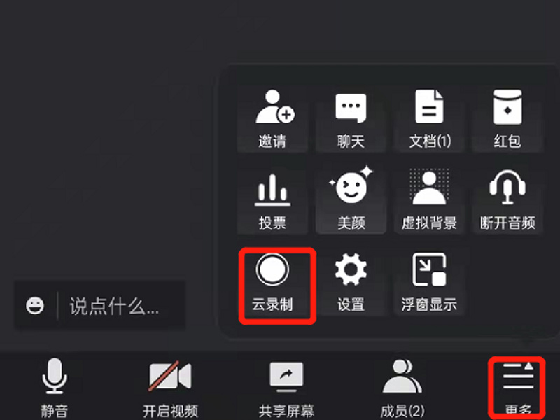3、点击“更多”,再点击“云录制”,向主持人申请会议视频录制,主持人通过后即开始录制视频。