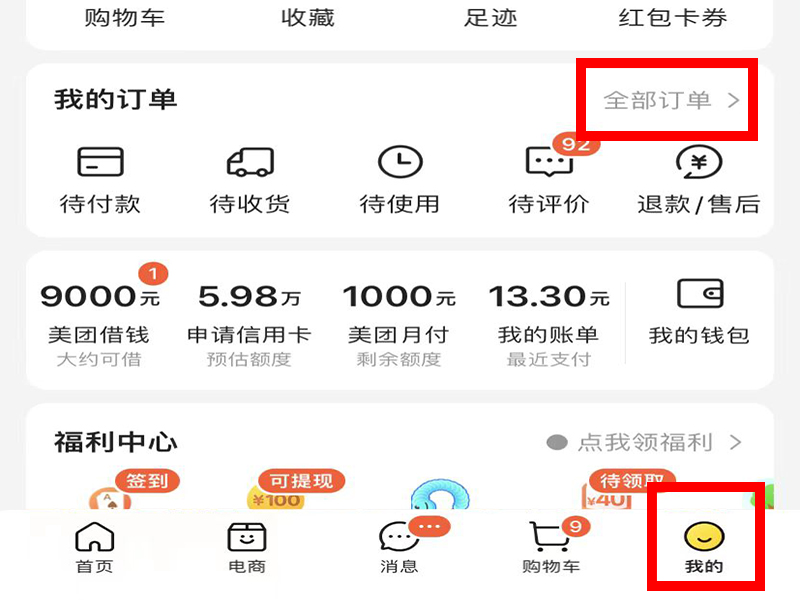 1、打开美团,进入“我的”的界面,再点击“全部订单”,进入“订单”界面。