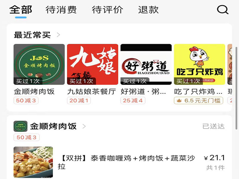 2、进入“订单”界面后,就能够查看点过的外卖订单记录了。
