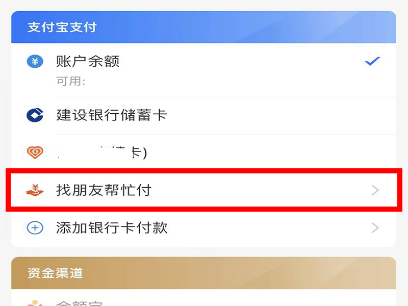 3、在弹出来的“付款方式”界面点击“找朋友帮忙付”即可。