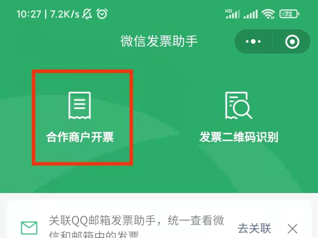 2、进入“微信发票助手”小程序,点击“合作商户开票”选择想要开发票的选项进入申请开具发票。