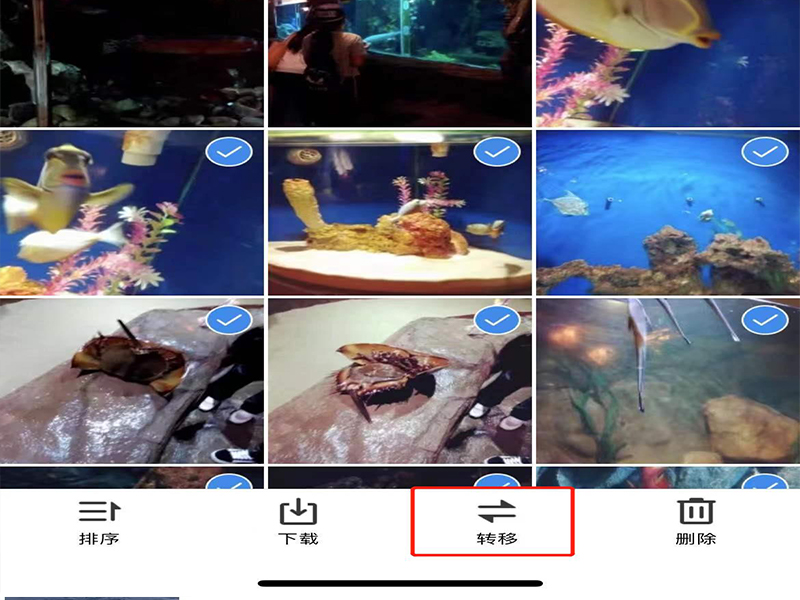 4、在批量管理页面上,勾选出需要转移的照片,并点击“转移”,进入选择转移相册页面。