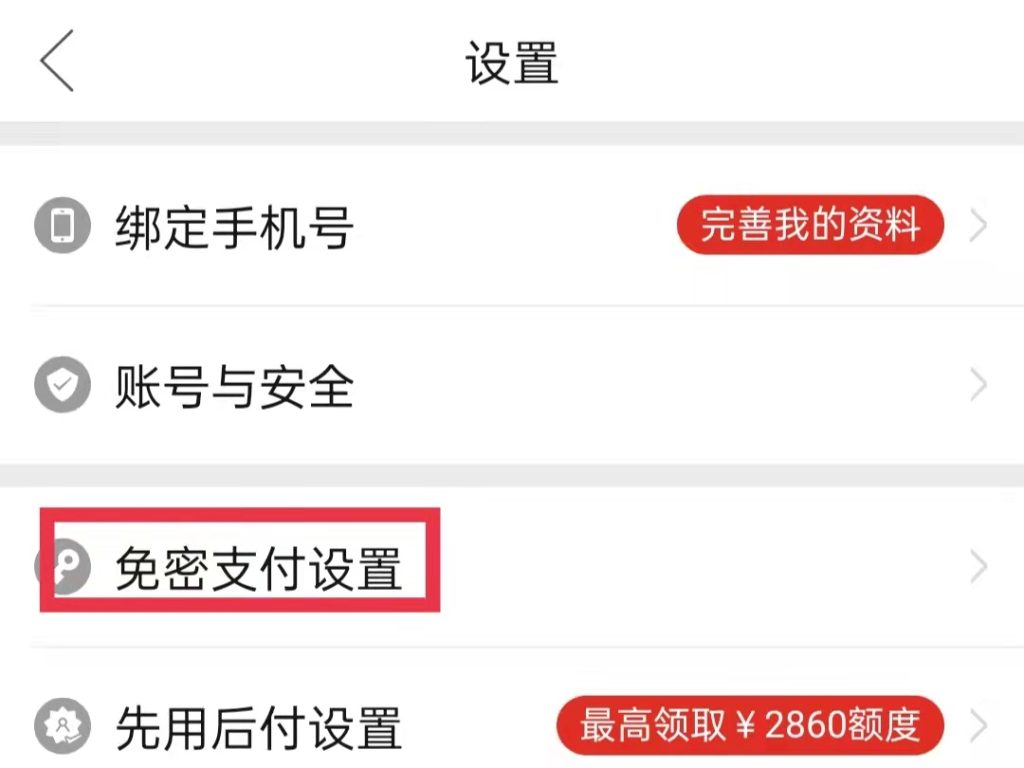 2.在设置界面找到免密支付设置,点击进入。