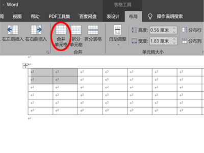3、选中单元格,单击“布局”->“合并单元格”,进行单元格的合并,其它需要合并的单元格也进行这项操作。