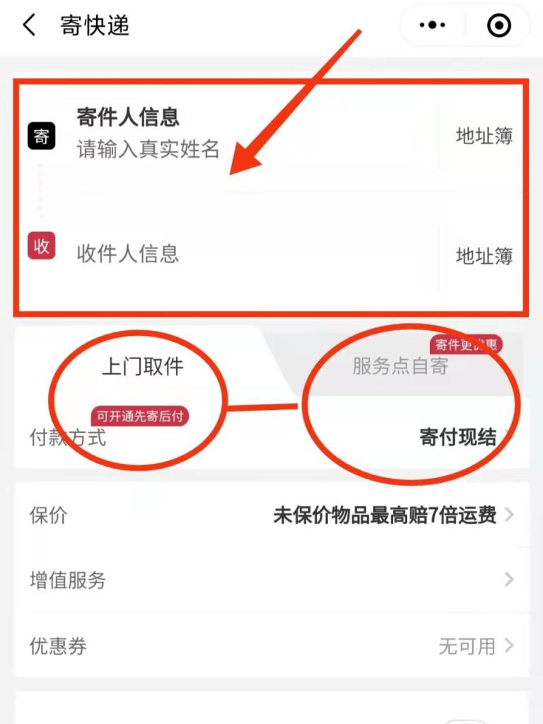 在寄快递界面填写寄件人、收件人、付款方式、寄件方式等信息后下单即可。
