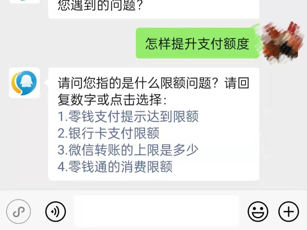 5.在输入框输入“怎样提升支付额度”后系统将自动回复你提升支付额度的方法。