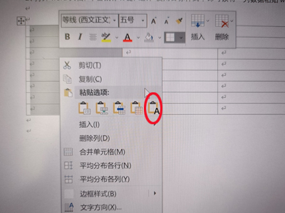 2、打开word文档,选中表格的一列,选择“只保留文本”的粘贴,即可以将一列数据粘贴word表格中。