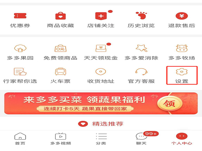 1、打开拼多多app,在个人中心页面上,点击“设置”,进入拼多多设置页面。