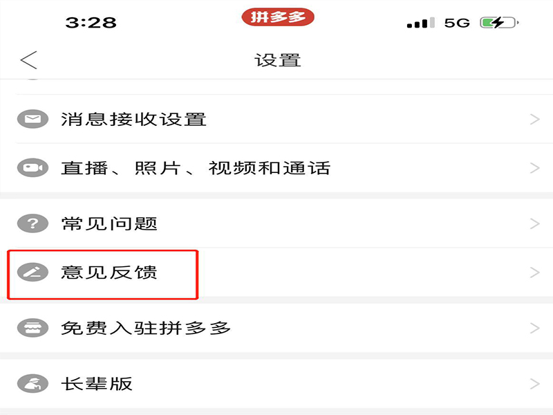2、在拼多多设置页面上,点击“意见反馈”,进入意见反馈页面。