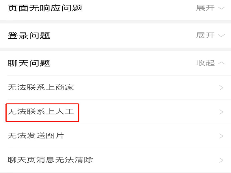 4、在功能异常&体验问题页面上,选择展开聊天问题,点击“无法联系上人工”,进入拼多多官方客服聊天页面。