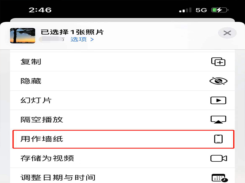 4、在照片工具栏中,找到并点击“用作墙纸”,进入手机壁纸预览页面。