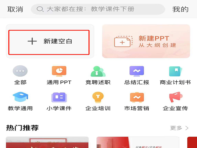 3、在演示页面上,点击“新建空白”,进入ppt制作页面。