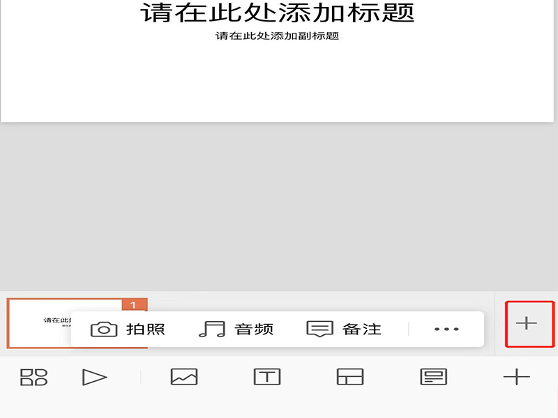 4、在ppt制作页面上,点击右下方的“+”图标,进入新建幻灯片功能页面。