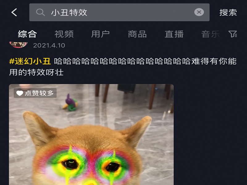 1、打开抖音,点击右上方的“搜索”,输入“小丑特效”,进入搜索结果界面。