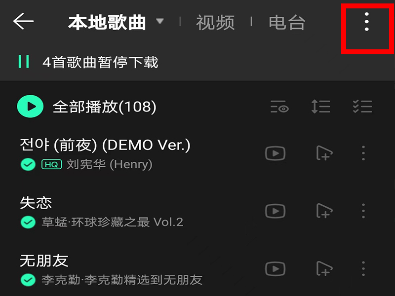2、进入“本地歌曲”界面后,点击右上角的“…”,进入功能栏界面。