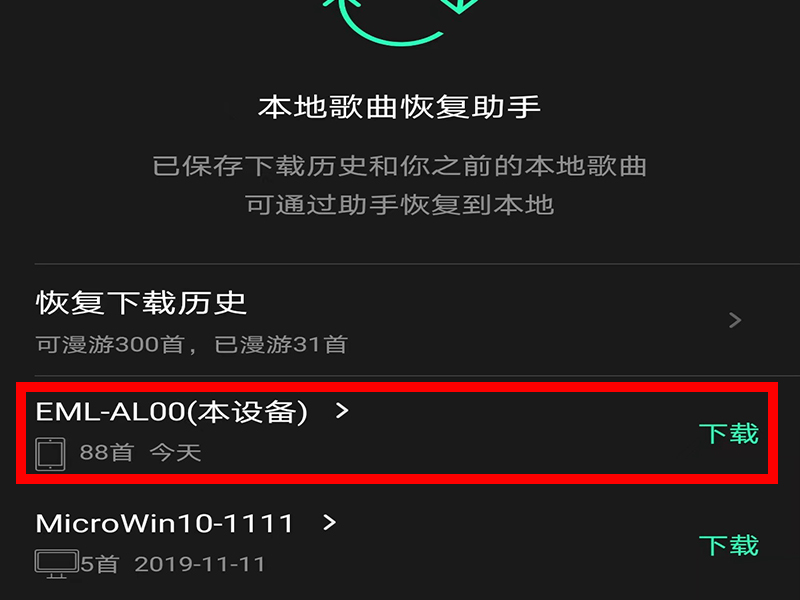 4、进入“本地歌曲恢复助手”界面后,就可以查看账号登录过的设备了。