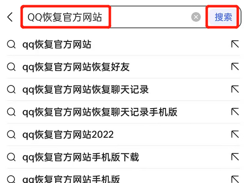 2、输入“QQ恢复官方网站”,点击“搜索”。