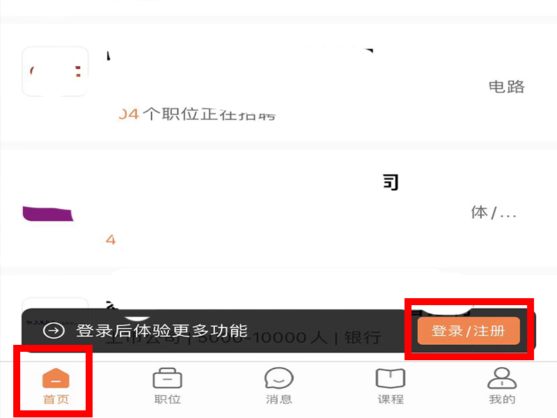 1、下载并打开前程无忧,进入首页界面后,点击右下角的“登录/注册”,进入“登陆”界面。