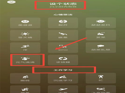 2、在“心情想法”或“工作学习”选项中任选一个状态,如“元气满满”。