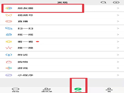 1、打开微信app,切换到“发现”页面,打开“朋友圈”。