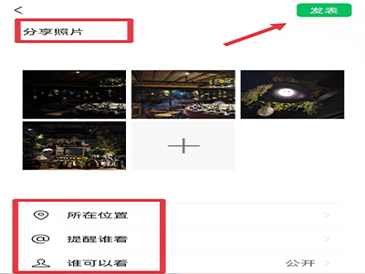 4、输入文案,设置观看权限等,点击右上角的“发表”按钮。