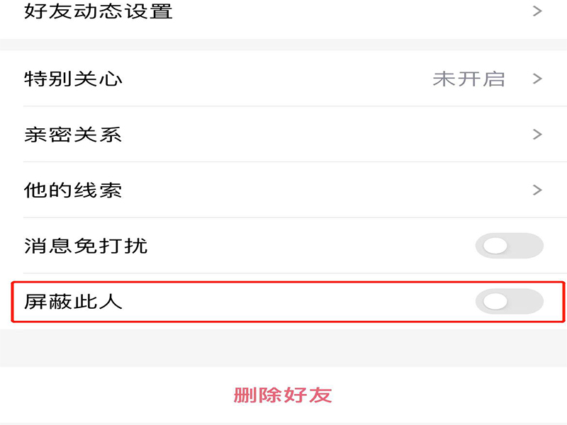 3、在好友设置页面上,点击“屏蔽此人”,即可屏蔽该好友。