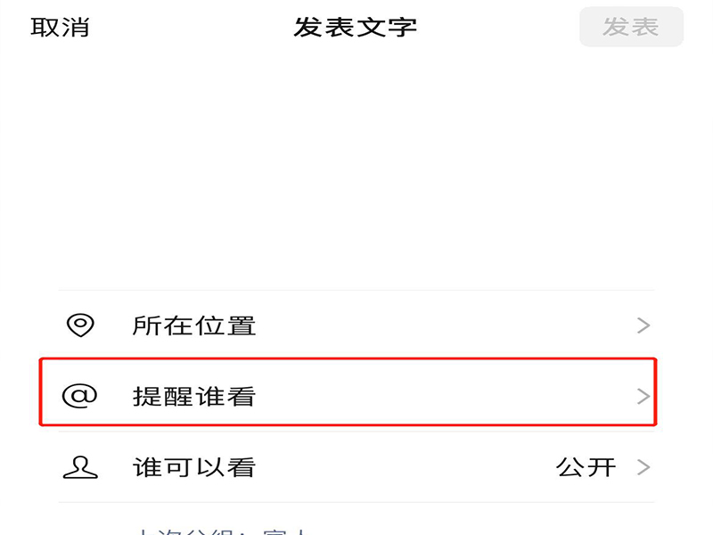 3、在朋友圈编辑页面上,点击“提醒谁看”,进入提醒谁看的好友列表。