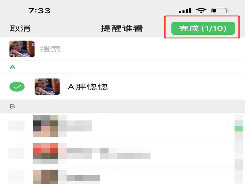4、在提醒谁看的好友列表中,选择需要艾特的好友,点击“完成”,即可将艾特的好友添加至朋友圈编辑页面。