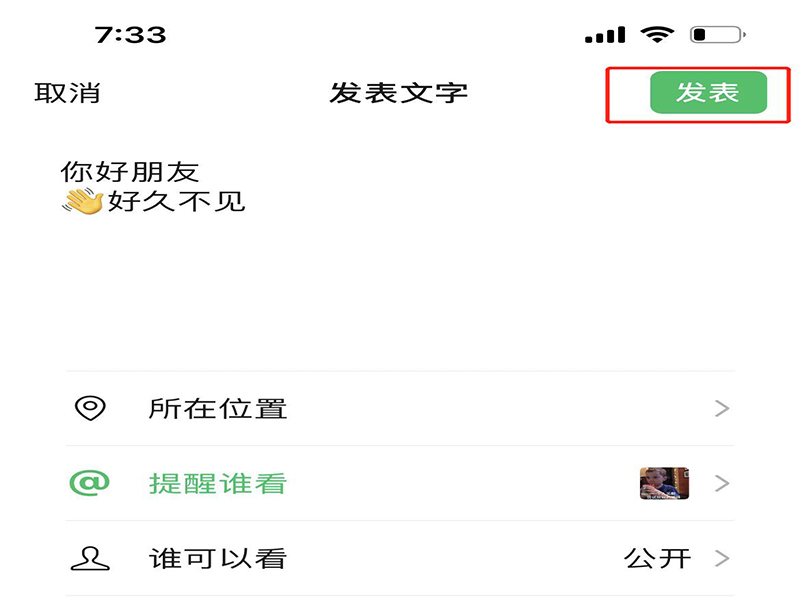 5、在朋友圈编辑页面上,输入文字内容,并点击“发表”,即可发表艾特别人的朋友圈。