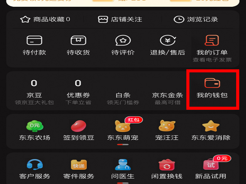 1、打开京东,点击进入“我的”的界面,再点击“我的钱包”。