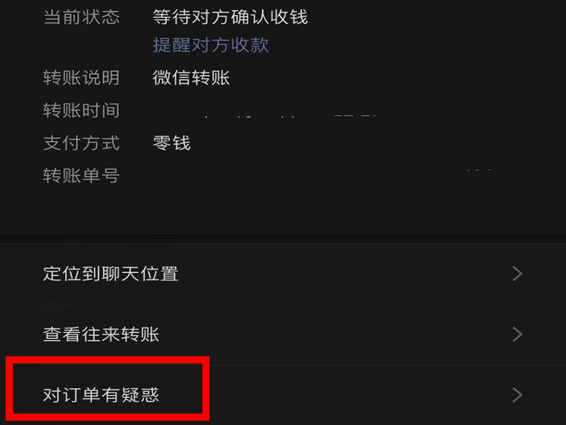 4、点击想要撤回的转账,在弹出来的“转账详情”界面点击“对订单有疑惑”。