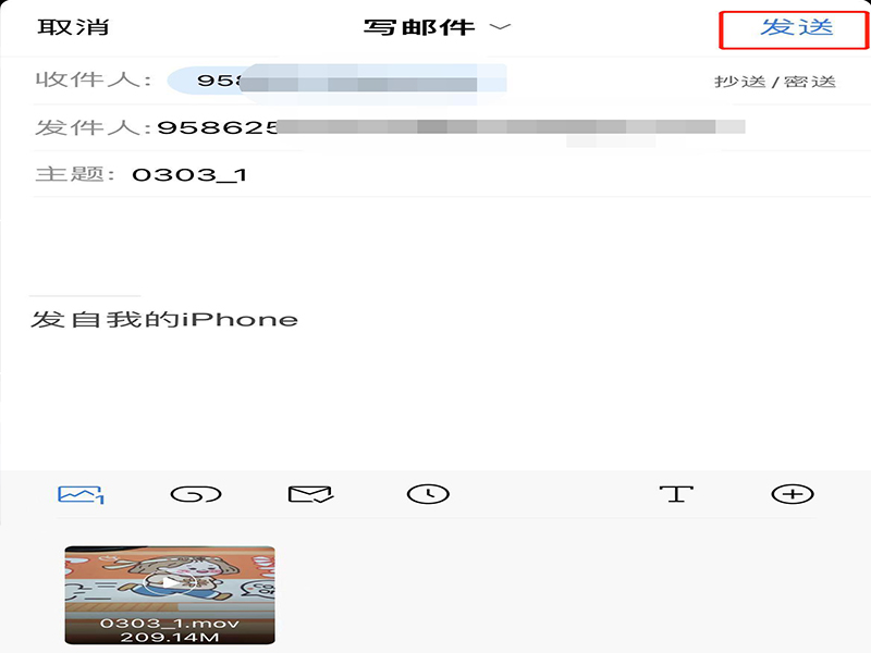 5、在邮件编辑页面上,填写好收件人的qq邮箱账号,即可点击“发送”,将视频发送至对方的qq邮箱中。
