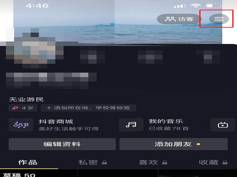 2、在我的个人页面上,点击右上角三横图标,打开抖音功能栏。