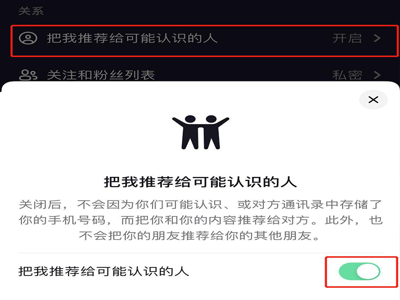 5、在隐私设置页面上,选择“把我推荐给可能认识的人”,点击绿色浮标,即可将其关闭。