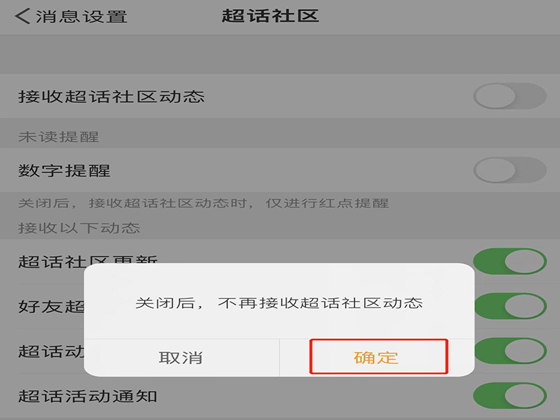 4、在超话社区设置页面上,选择关闭“接收超话社区动态”,并点击“确定”,即可不再接收超话社区动态消息。