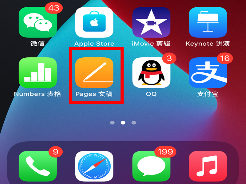 1、打开苹果手机主界面,找到并点击“pages文稿”。