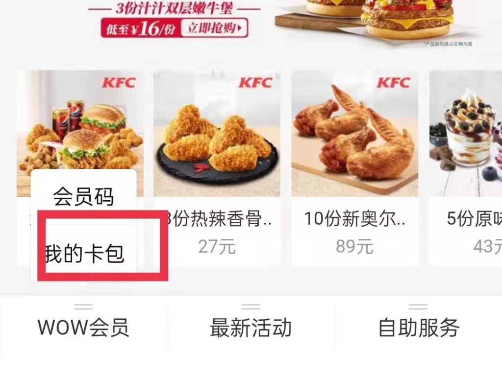 3.进入肯德基生活号界面,点击wow会员,点击我的卡包。