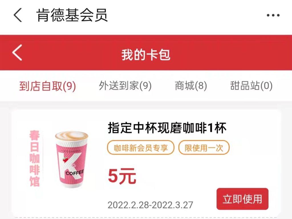 4.进入我的卡包后,就可以看到肯德基的各种优惠券,点击即可使用。
