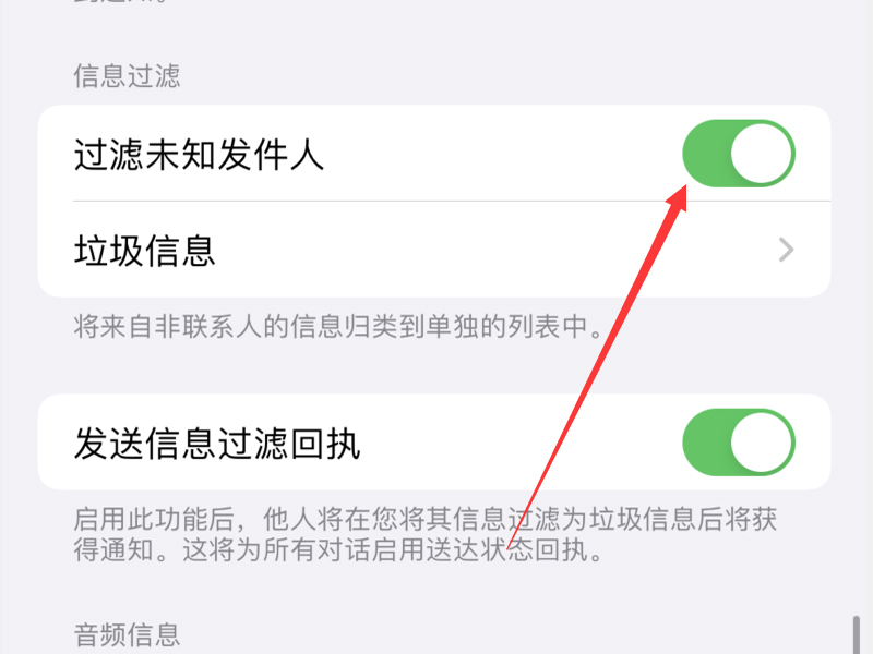 2、开启“过滤未知发件人”按钮的开关即可。