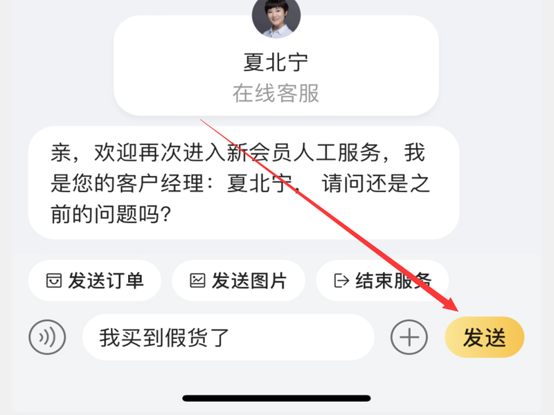 4、在对话框中输入遇到的假货问题进行发送即可。
