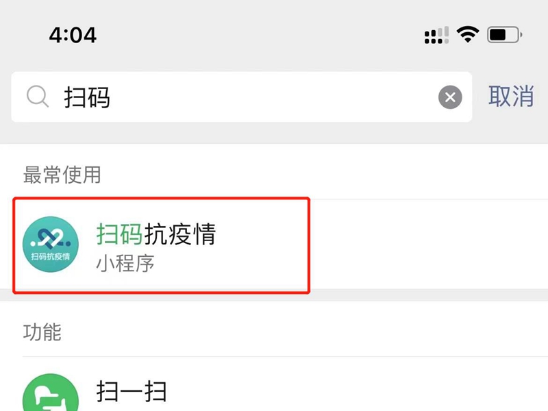 1、微信在“通讯录”上方的搜索栏处搜索“扫码抗疫情”,进入该小程序。