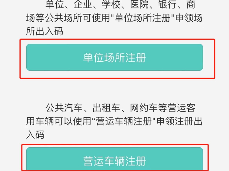 3、根据需求选择“单位场所注册”或“营运车辆注册”,然后填写完信息,完成后即可获得出入健康码。