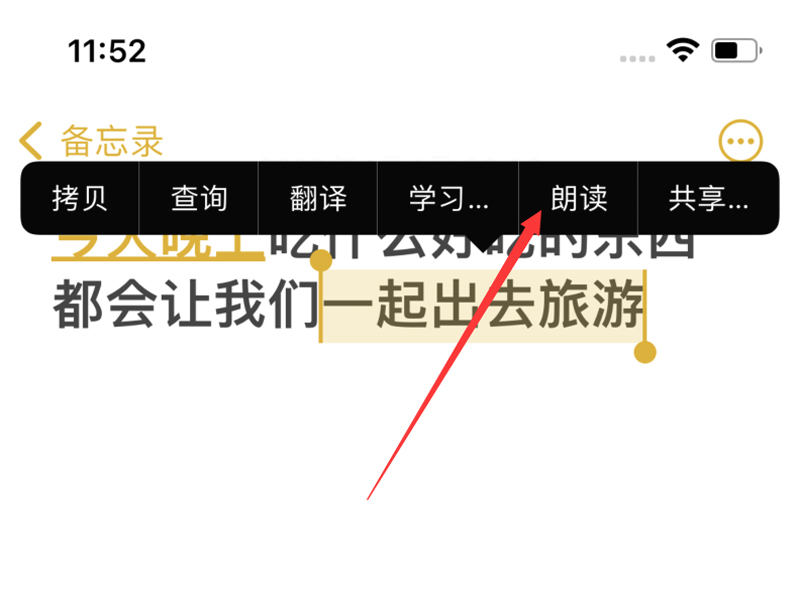 3、在功能栏里找到并点击“朗读”即可开启朗读备忘录的功能。