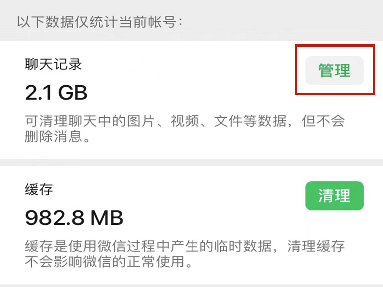 4、点击“管理”进入清理微信聊天记录页面。
